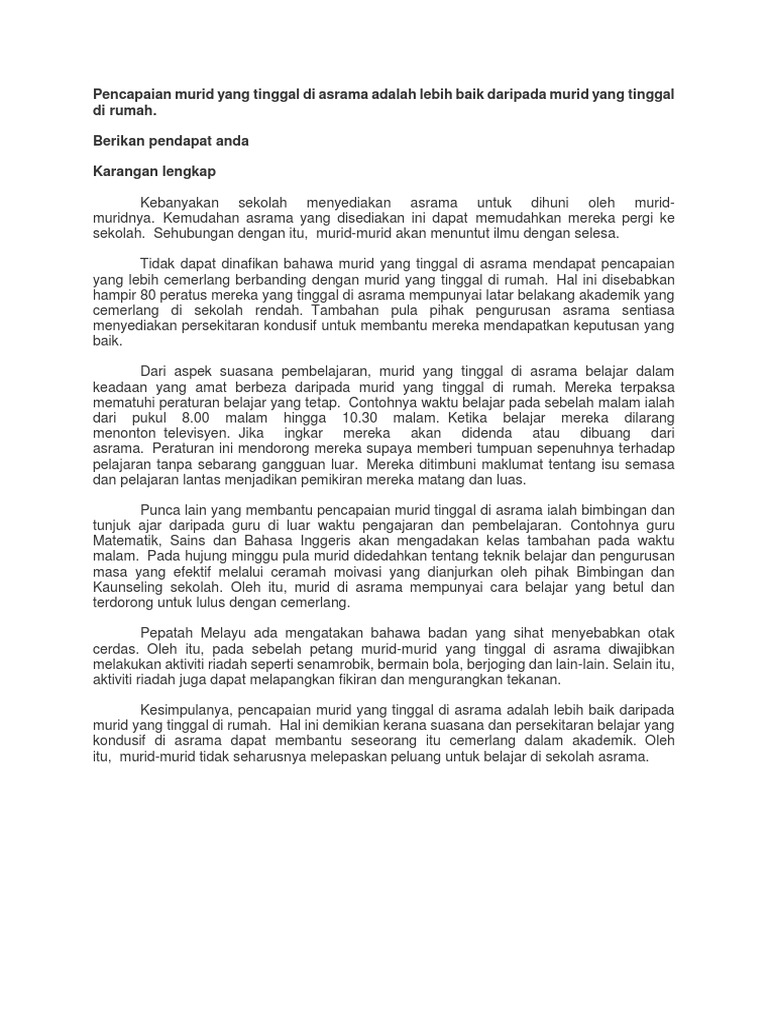 Pencapaian Murid Yang Tinggal Di Asrama Adalah Lebih Baik Daripada Murid Yang Tinggal Di Rumah Berikan Pendapat Anda Karangan Lengkap