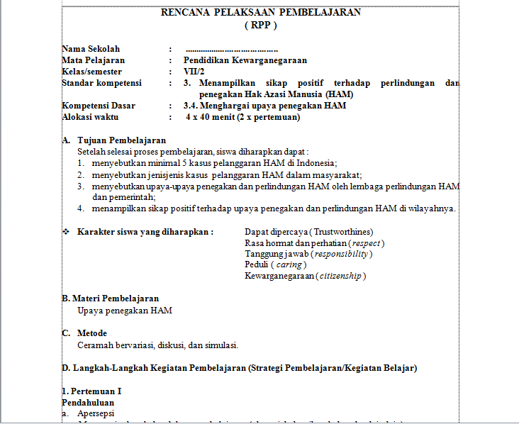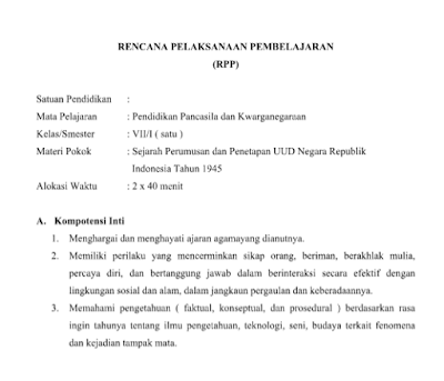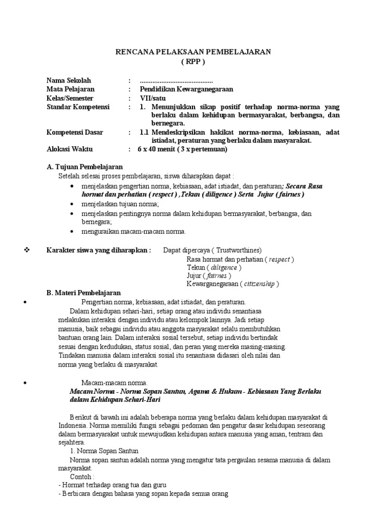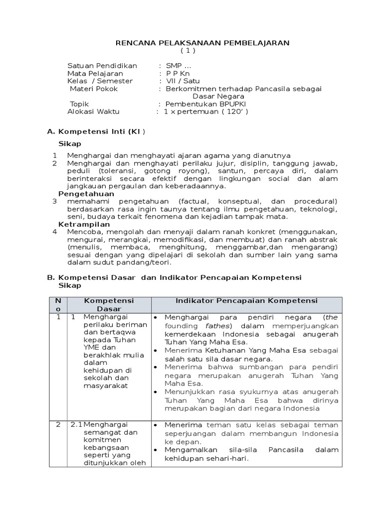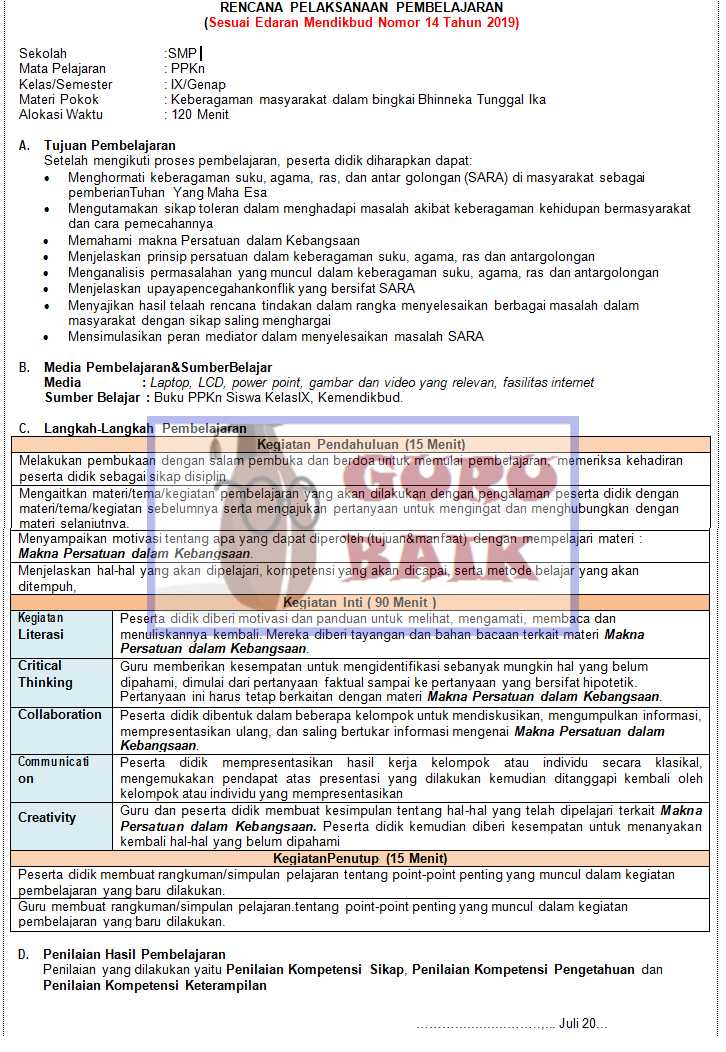 Contoh Rpp Satu Lembar Pkn Smp Mts Terbaru Daring 2020 Penaguru Com