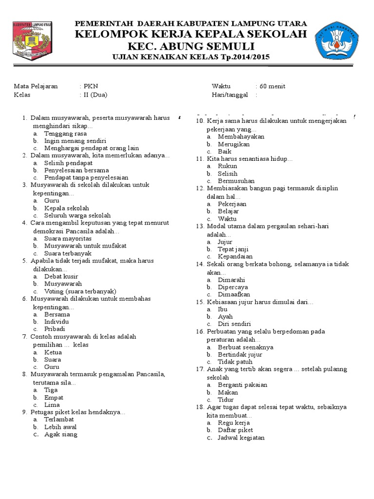 Soal Pkn Kelas 2 Sd Semester 1 2 Dan Kunci Jawaban Ktsp Kurikulum 2013 Info Pendidikan Terbaru