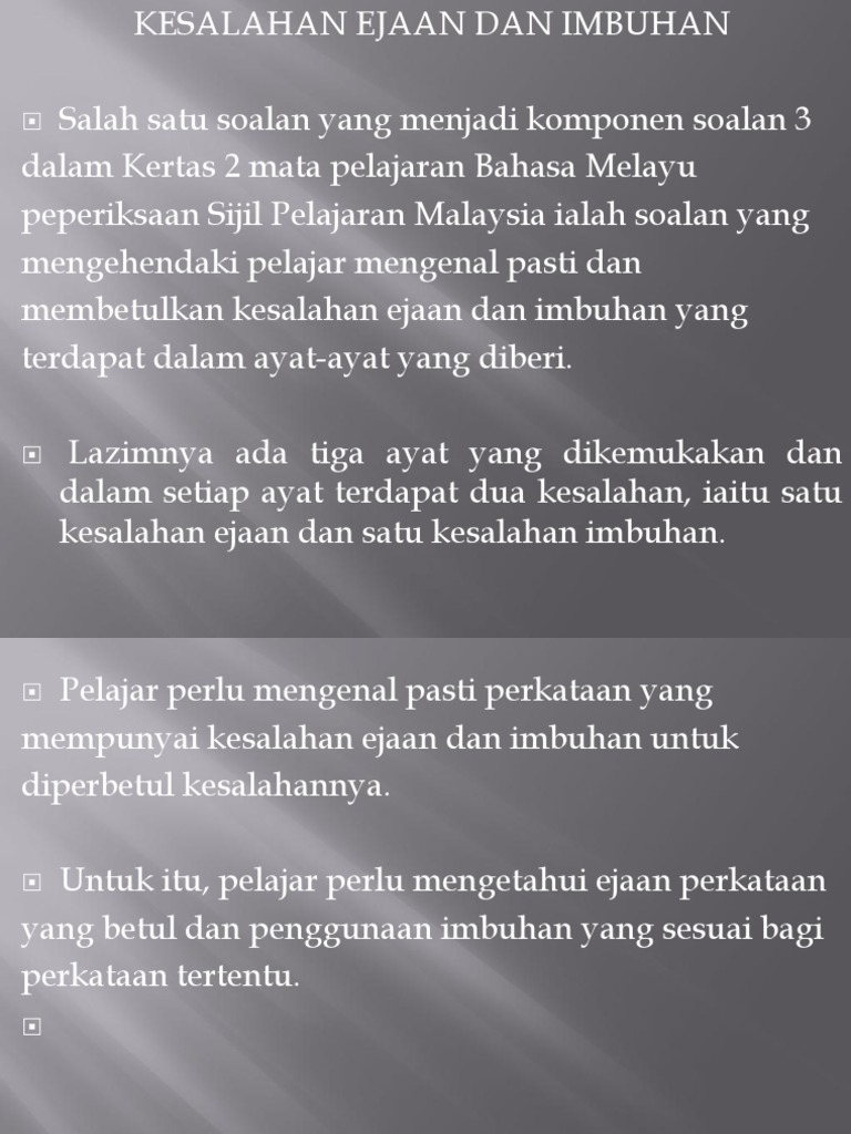 Kesalahan Ejaan Dan Imbuhan Pptx Pengetahuan Dan Kemahiran Bahasa C Membetulkan Ejaan Dan Imbuhan Dalam Setiap Ayat Di Bawah Terdapat Satu Kesalahan Course Hero