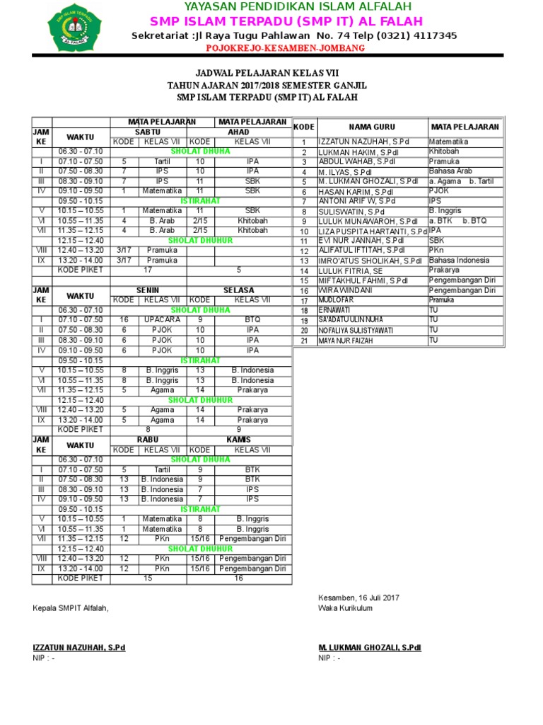 Jadwal Pelajaran Kelas Vii Semester 1 Tahun Pelajaran 2018 2019 Sekolah Santa Clara