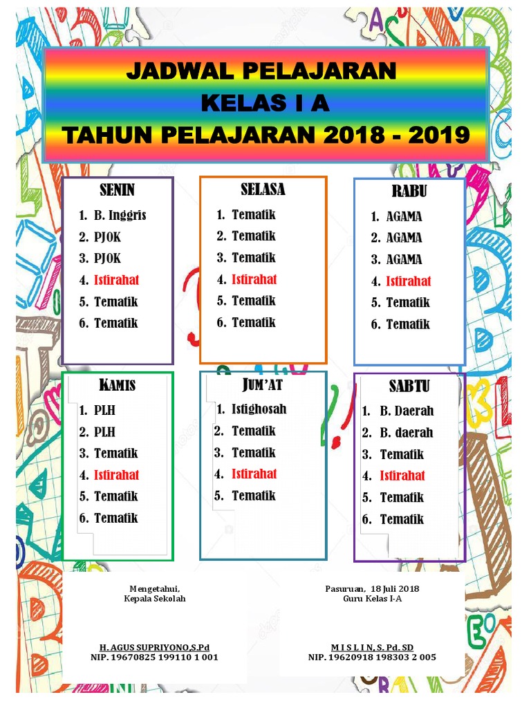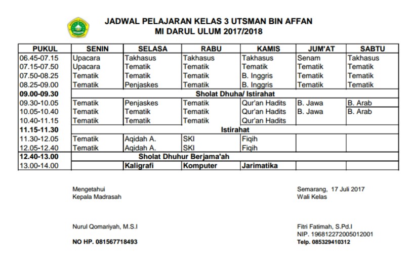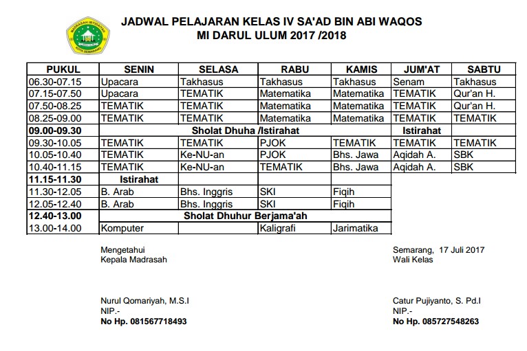 Jadwal Pelajaran Kelas Iv Sa Ad Bin Abi Waqos Tahun Pelajaran 2017 2018 Mi Darul Ulum Wates