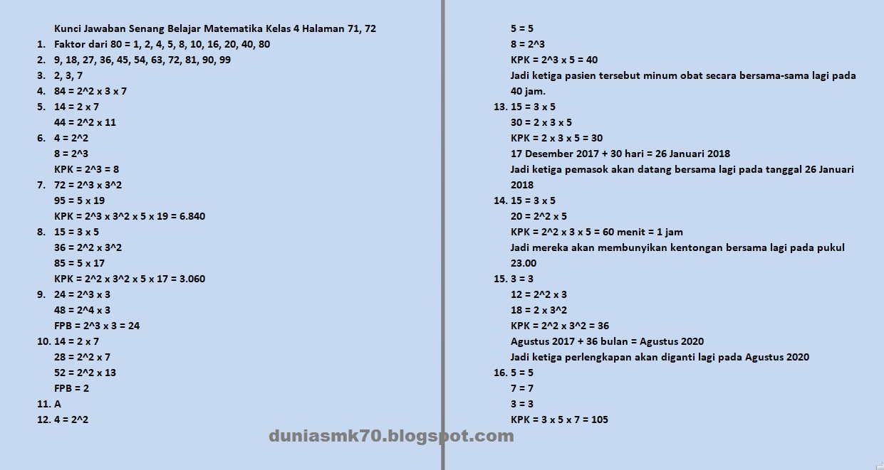 Kunci Jawaban Buku Senang Belajar Matematika Kelas 4 Kurikulum 2013 Revisi 2018 Halaman 71 72 Kunci Soal Matematika