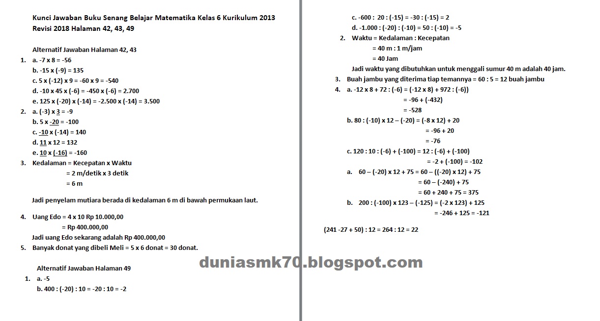Kunci Jawaban Buku Senang Belajar Matematika Kelas 6 Kurikulum 2013 Revisi 2018 Halaman 17 18 42 43 49 56 57 58 Dunia Smk