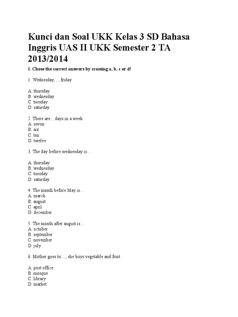 Rekan rekan yang berbahagia kali ini kami membagikan perangkat evaluasi berupa soal uts sd pelajaran bahasa inggris semester 1. Kelima puluh soal ini saya ambil dari beberapa sumber seperti buku artikel online dan beberapa di antaranya saya buat. Bahasa inggris kelas 3 sd a.
