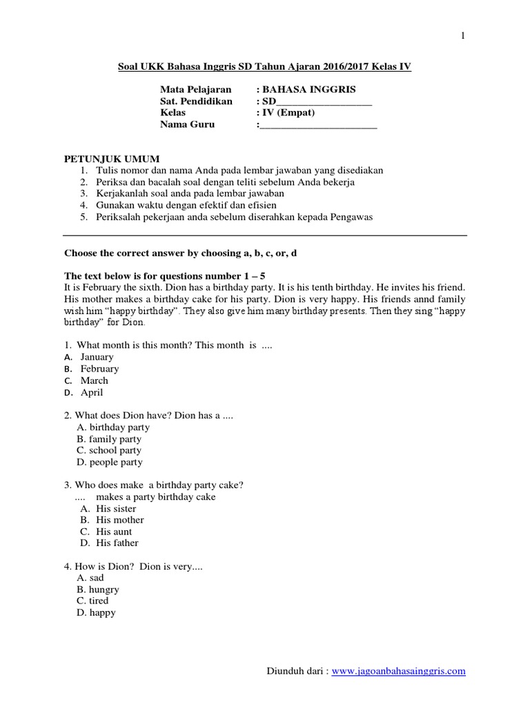 Soal Dan Kunci Jawaban Ukk Pat Bahasa Inggris Kelas 4 Semester 2 Sd Mi Sudut Baca