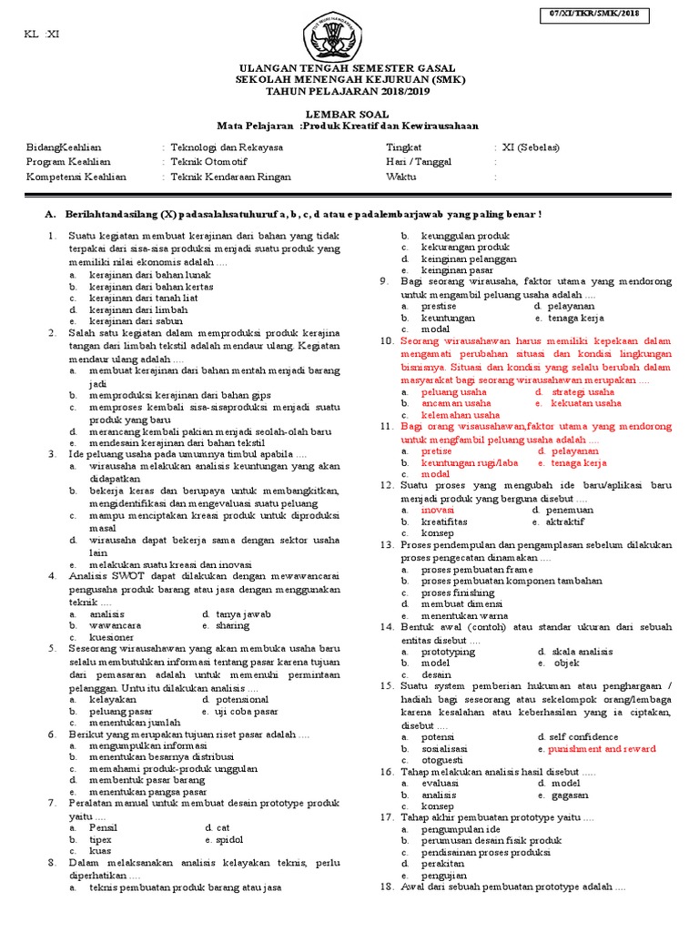 Soal Produk Kreatif Dan Kewirausahaan Pkk Kelas Xi Semester 1 Kurikulum 2013 Revisi 2018 Kunci Soal Matematika