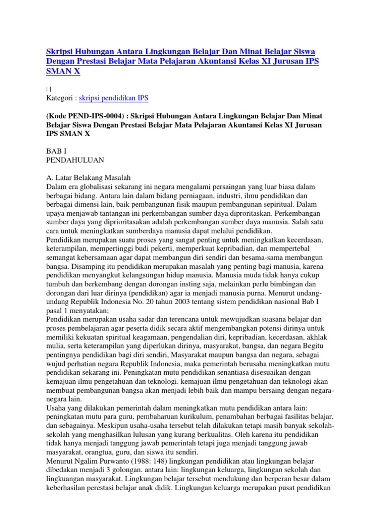 Skripsi Hubungan Antara Lingkungan Belajar Dan Minat Belajar Siswa Dengan Prestasi Belajar Mata Pelajaran Akuntansi Kelas Xi Jurusan Ips Sman X