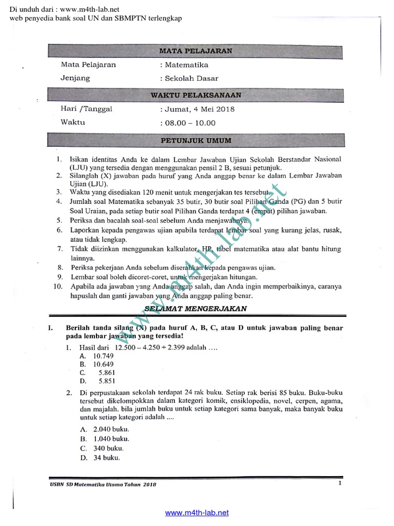 Download Soal Usbn Sekolah Dasar Sd Tahun 2018 Bidang Matematika Provinsi Jawa Barat M4th Lab