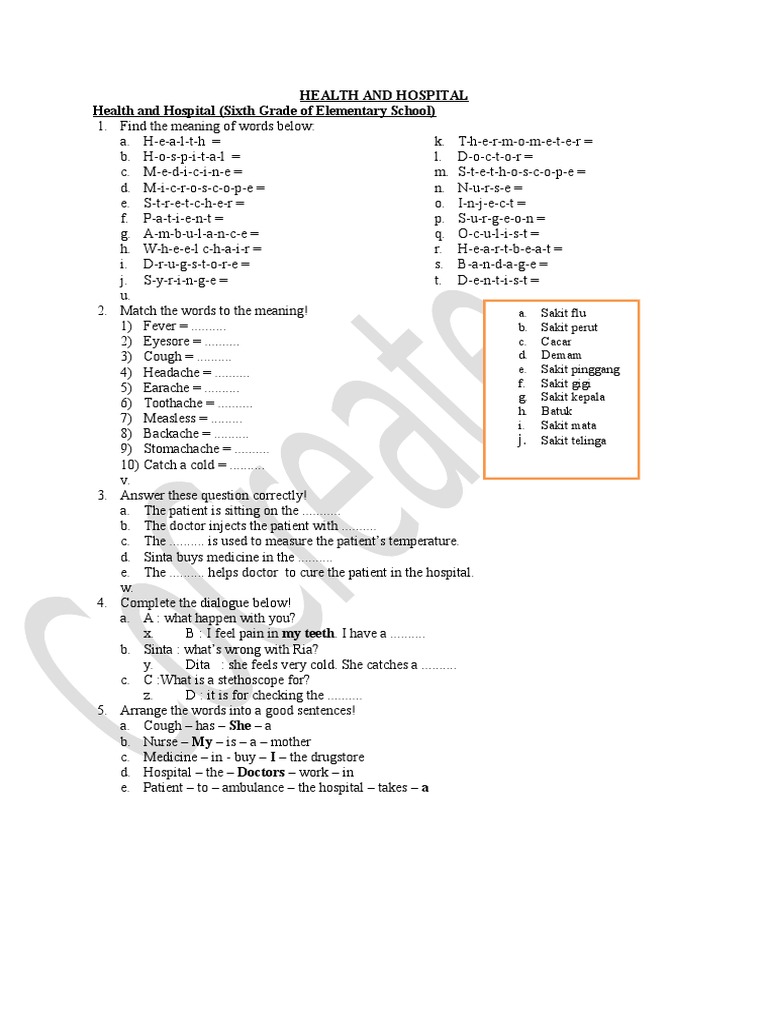 Materi Bahasa Inggris Bab 9 Health And Hospital Kesehatan Dan Rumah Sakit Media Pembelajaran Mi Sd Kelas 6