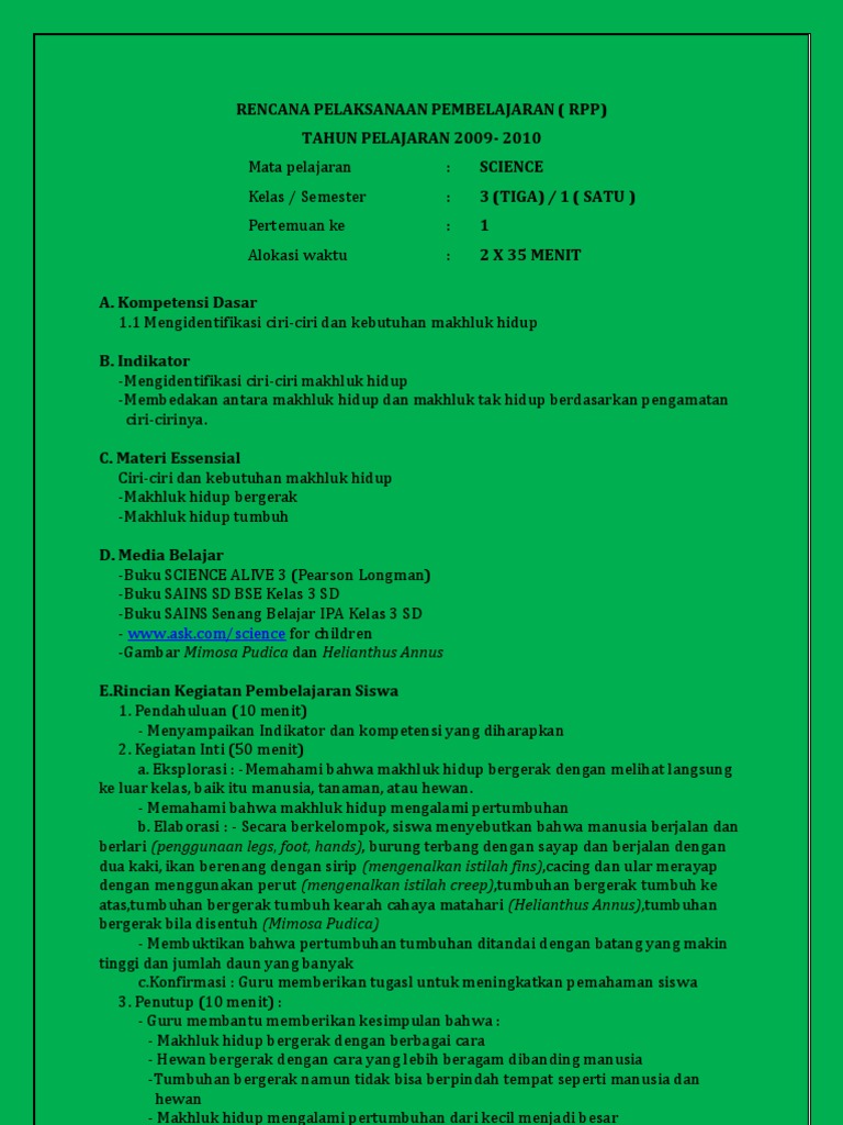 Rpp Ipa Sd Kelas 3 Semester 1 Materi Ciri Ciri Dan Kebutuhan Makhluk Hidup Tinta Pendidikan Indonesia