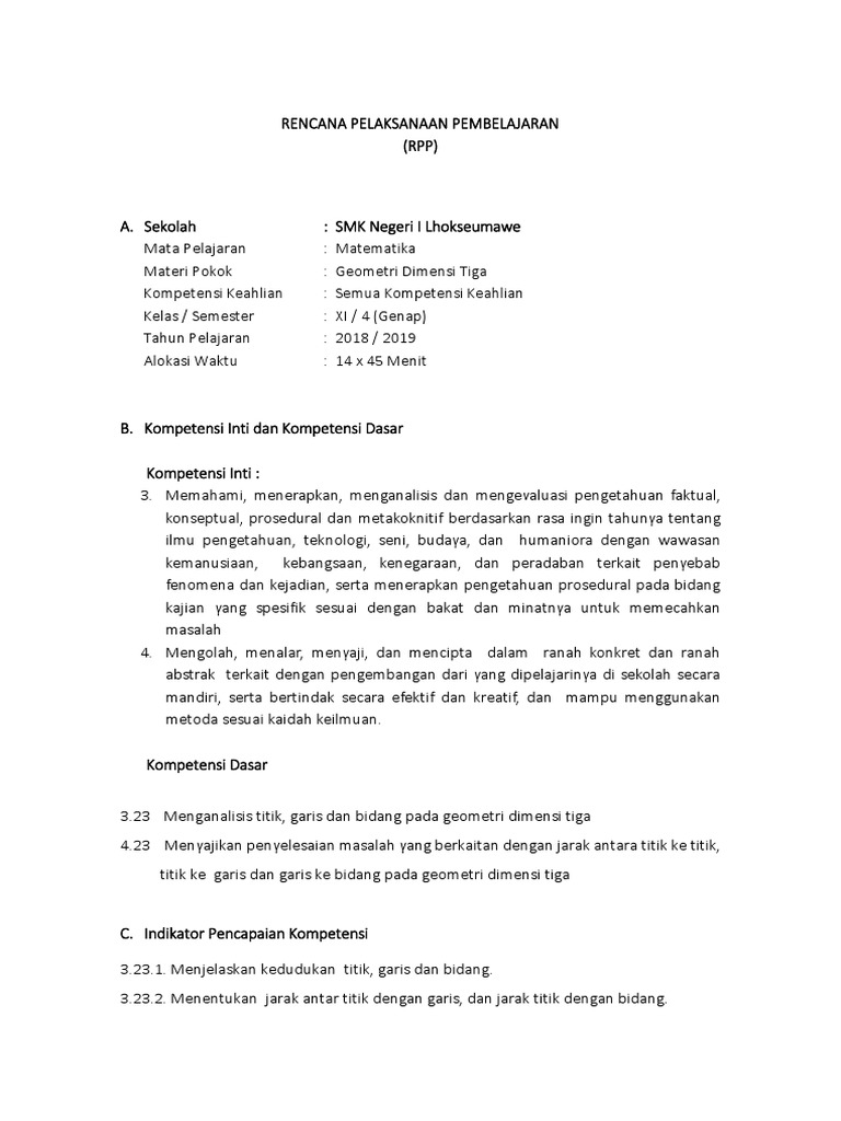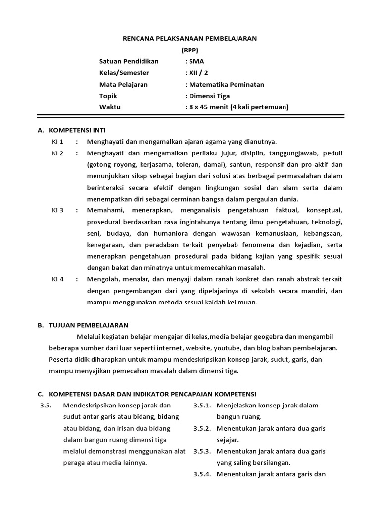 Rpp Matematika Sma Xii Peminatan Bab 5 Dimensi Tiga