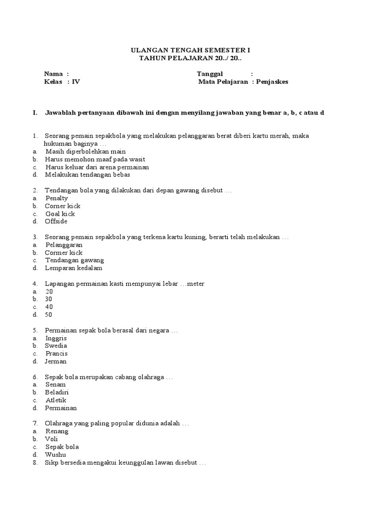 Soal Penjas Kelas 4 Tahun Ajaran 2020 Semester 1 2