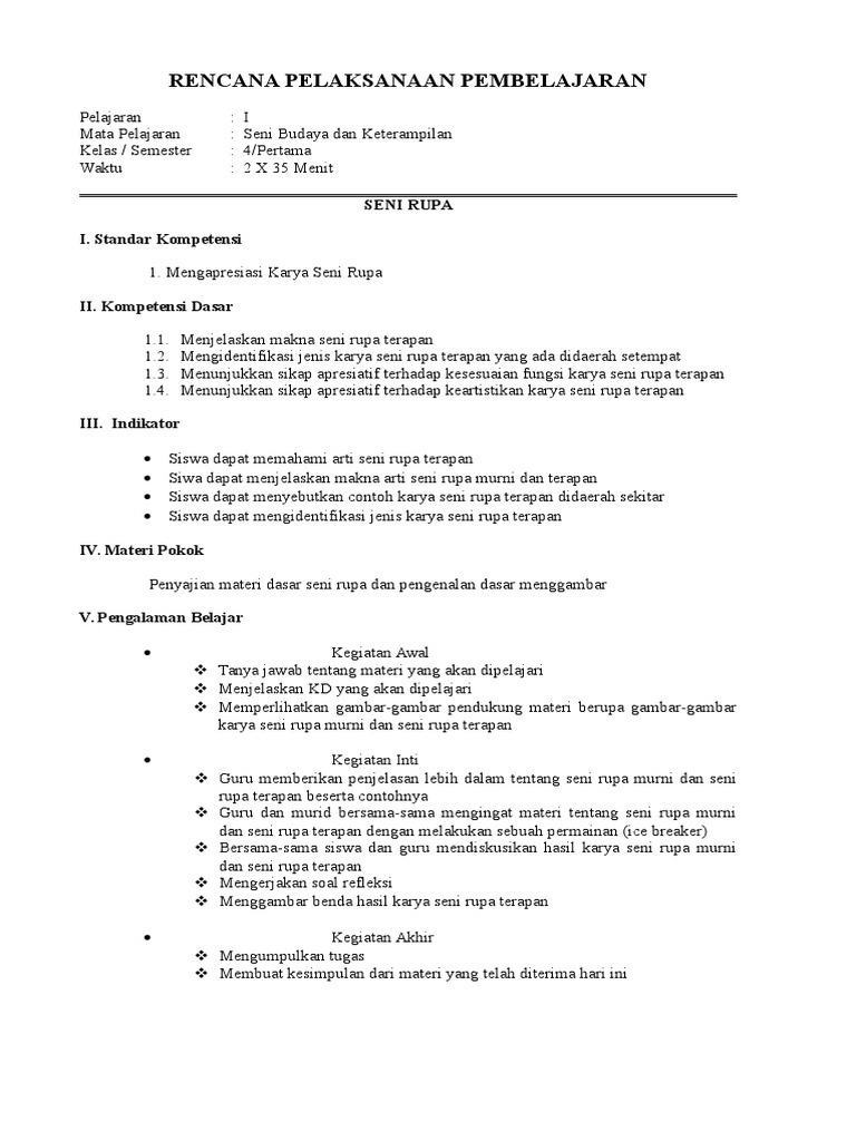 Doc Contoh Rpp Seni Budaya Dan Kesenian Kelas 4 Sd Berkarakter Semester 1 Adi Lesmana Academia Edu
