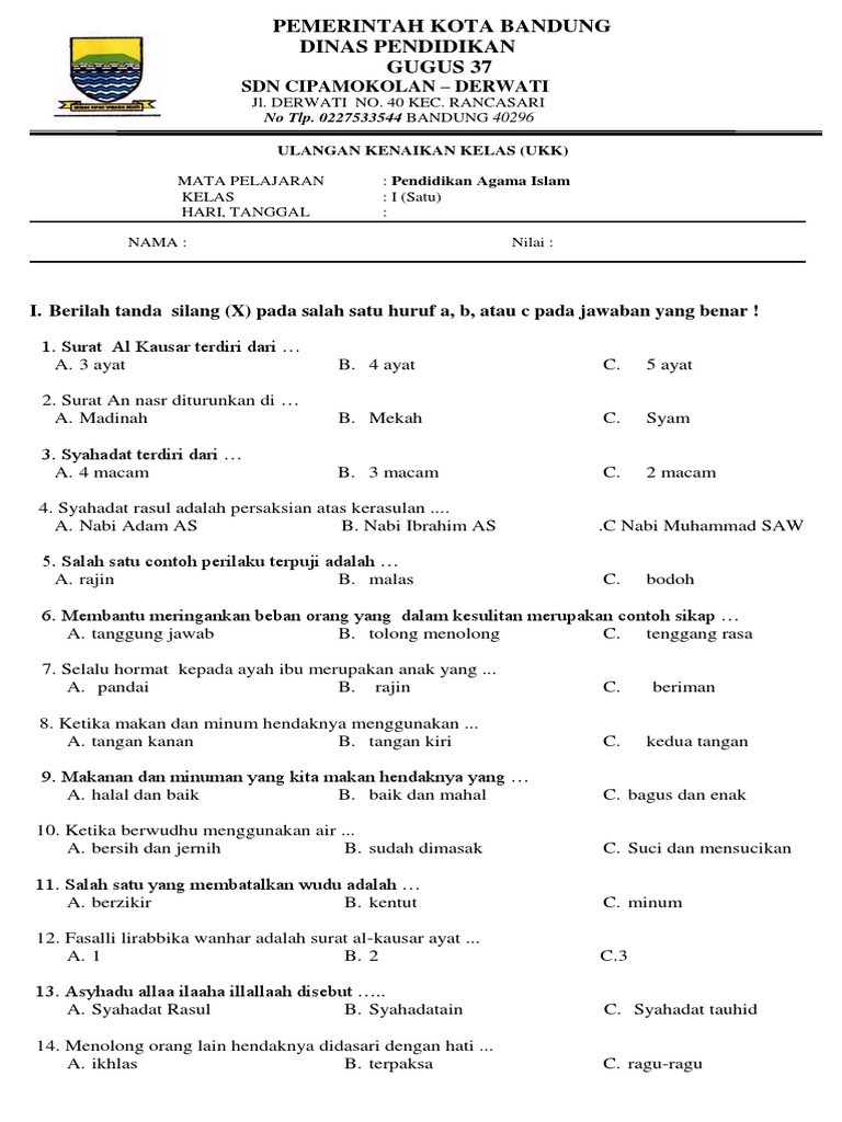 Soal Uas Pai Kelas 2 Sd Semester 1 Ganjil Dan Kunci Jawaban Bimbel Brilian