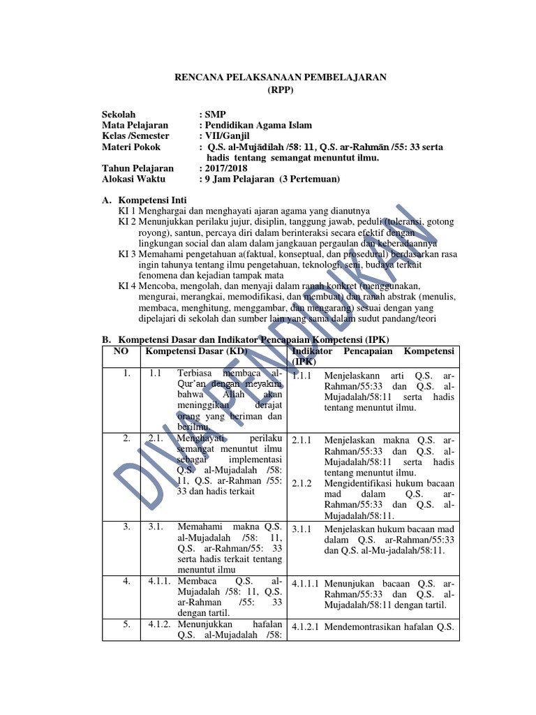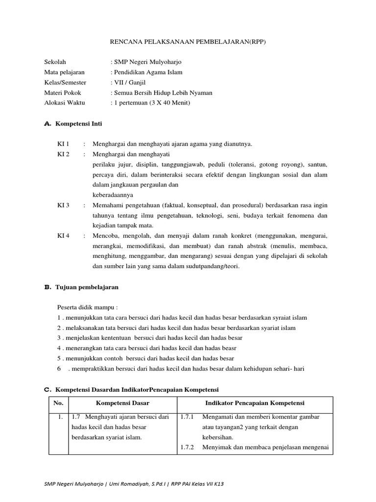 Rpp Pai 7 Pelaksanaan Pembelajaran Pendidikan Agama Islam Kelas 7 Drs Solihin Smpn 1 Utan 1 Rencana Pelaksanaan Pembelajaran 1 Mata Pelajaran Pai Pdf Document