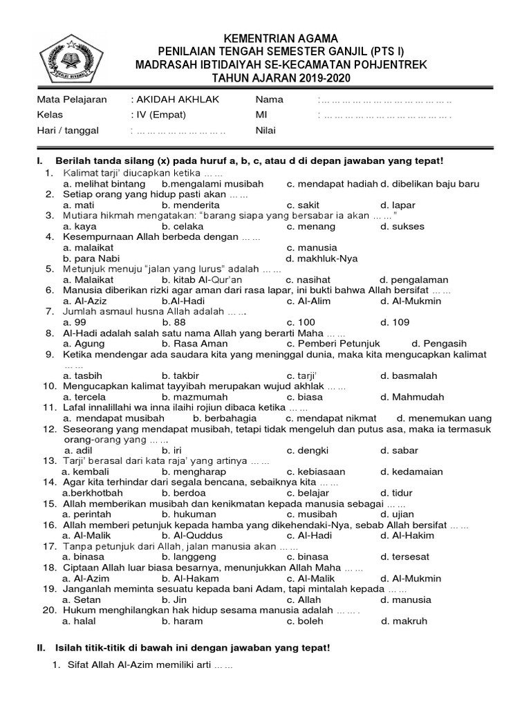 Soal Akidah Akhlak Kelas 4 Sd Mi Semester 2 Dan Kunci Jawaban