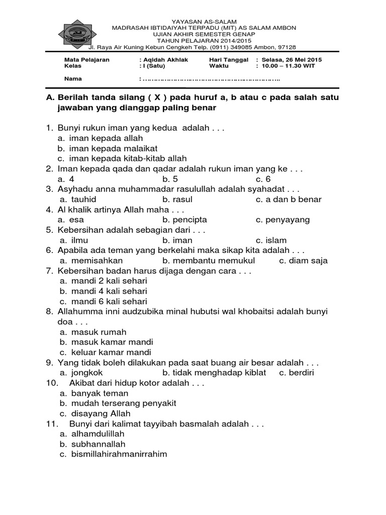 Contoh Soal Pts Uts Akidah Akhlak Semester 1 Kelas 1 2 3 4 5 6 Sd Mi Kurikulum 2013 Ruang Pendidikan