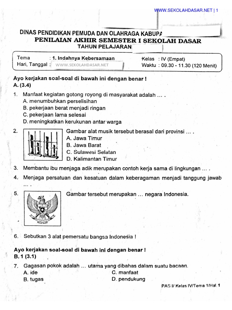 Soal Ulangan Harian Tematik Kelas 4 Empat Sd Mi Tema 1 Subtema 1 Keberagaman Budaya Bangsaku Ahzaa Net