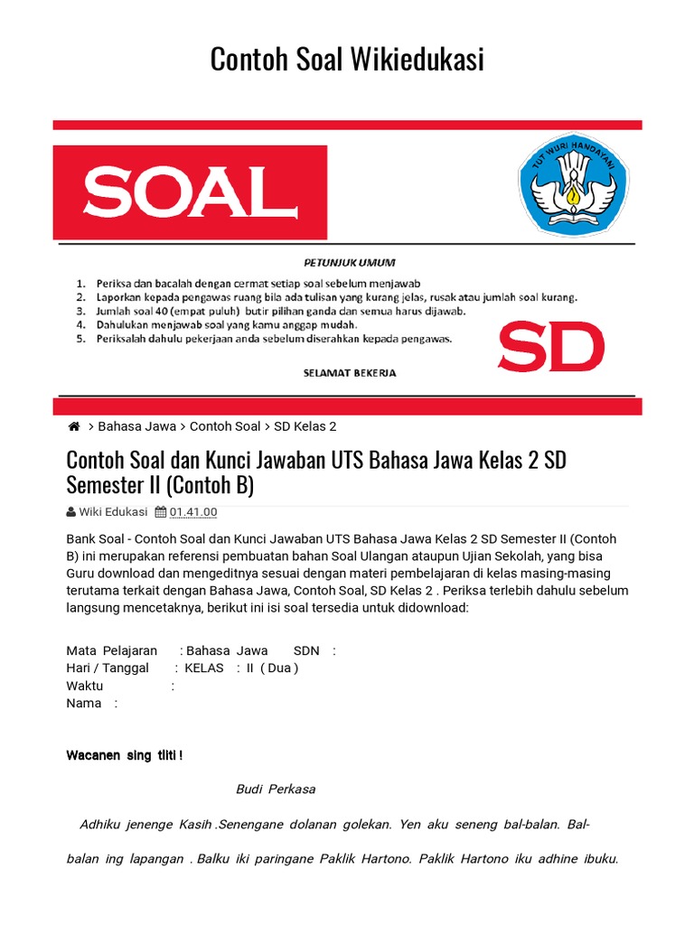 Soal Bahasa Jawa Kelas 4 Sd Semester 2 Mata Pelajaran B Jawa Hari Tanggal Bacalah Dengan Pdf Document