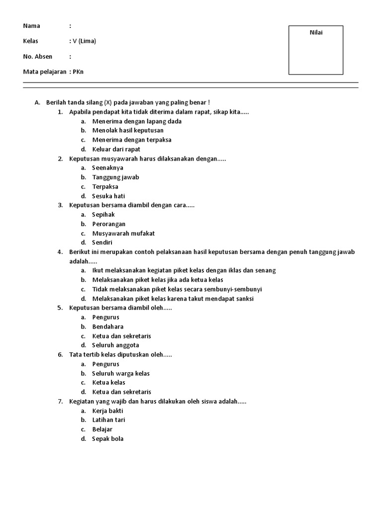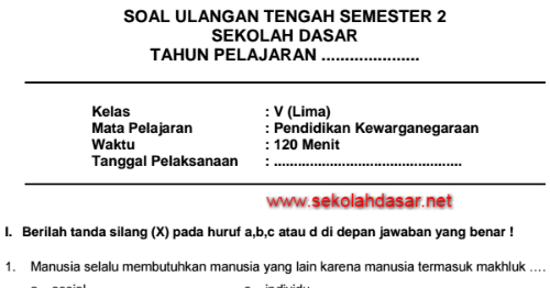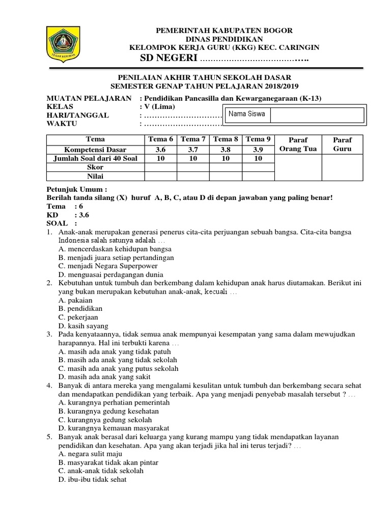 Soal Ulangan Kenaikan Kelas Ukk Pkn Kelas 5 Sd Tahun 2019 Sdn Airlangga Subang