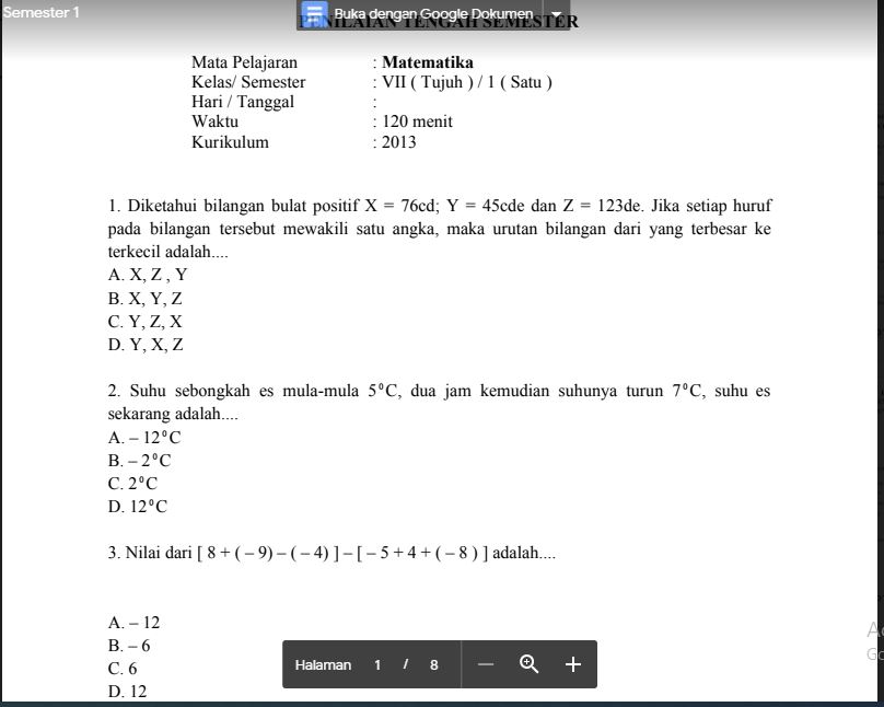 Kisi Kisi Soal Dan Jawaban Matematika Smp Kelas 7 Semester Genap Kurikulum 2013 Didno76 Com
