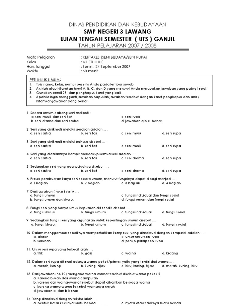 Soal Seni Budaya Kelas 7 Semester 1 2 Dan Jawabannya Kurikulum 2013 Tahun 2018 Info Pendidikan Terbaru