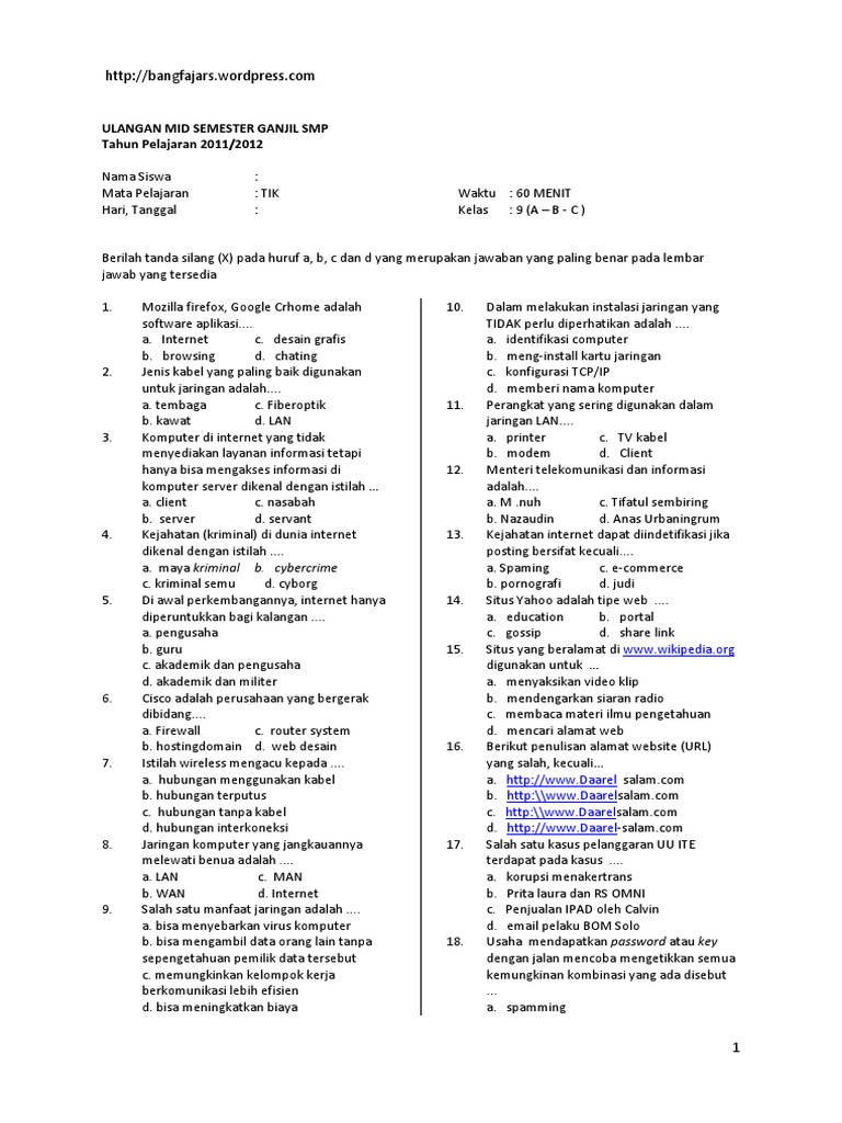 Ulangan Harian 1 Tik Kelas 9 Smt 1 Bab Internet Dan Intranet 2015 Mr Mung Dot Com