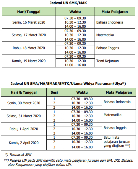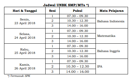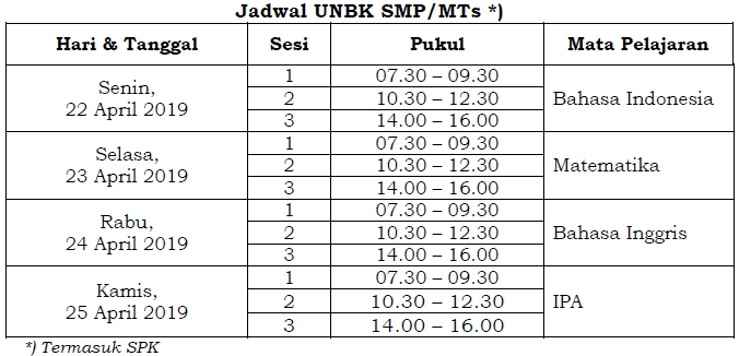 Melalui pedoman operasional standar pos penyelenggaraan un 2019 bambang suryadi ketua bsnp menginformasikan jadwal pelaksanaan unbk dan unkp baik untuk jenjang smp dan sma. Ujian nasional smp mts tahun 2019 sebagian besar akan menggunakan sistem unbk atau ujian nasional. Rabu 8 april 2020.