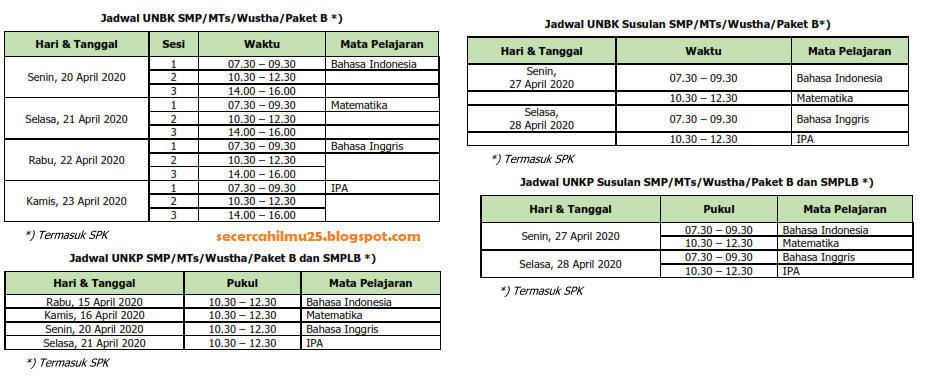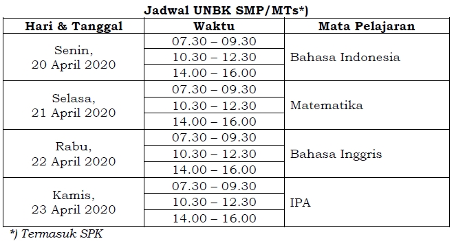 Jadwal Unbk Smp Mts 2020 Utama Dan Susulan Tahun Pelajaran 2019 2020 Website Pendidikan