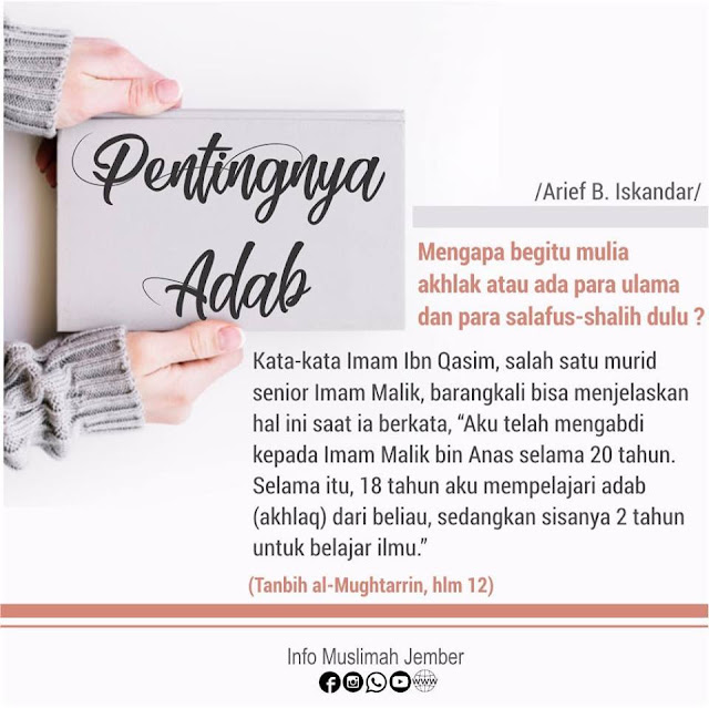 Mereka yang mendapatkan pendidikan agama yang tepat akan mengetahui betapa pentingnya adab dalam kehidupan. Kejadian ini mengingatkan kita akan pentingnya mempelajari adab bagi para pemburu ilmu. Taalmna aladb thlathyn aaamaotaalmna alaalm aashryn ibn mubarak rahimahullah berkata kami belajar adab tatakrama 30 tahun.