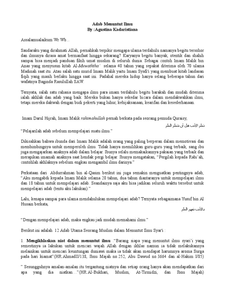Karena dari situ beliau banyak mempelajari adab itulah yang kurang dari kita saat ini. Di dalam surat thaha ayat 11 sampai 14 sangat jelas tentang hal itu sebelum allah t a ala mewahyukan kepada nabi musa alaihissalam bahwa dia allah yang tiada ilah tuhan yang berhak disembah dengan benar selain dia. Seorang penuntut ilmu harus menghiasi dirinya dengan adab dan akhlak mulia.