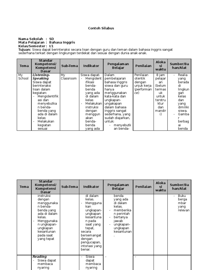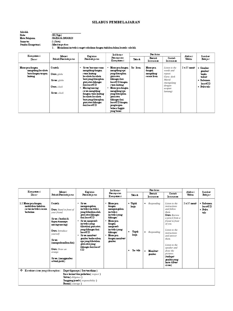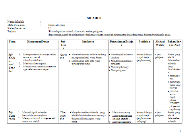 Silabus Bahasa Inggris Kelas 3 K13 Edisi 2019 Semester 1 Guru Maju