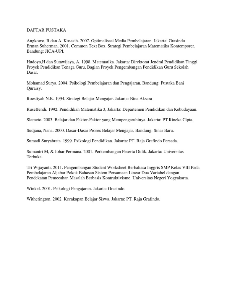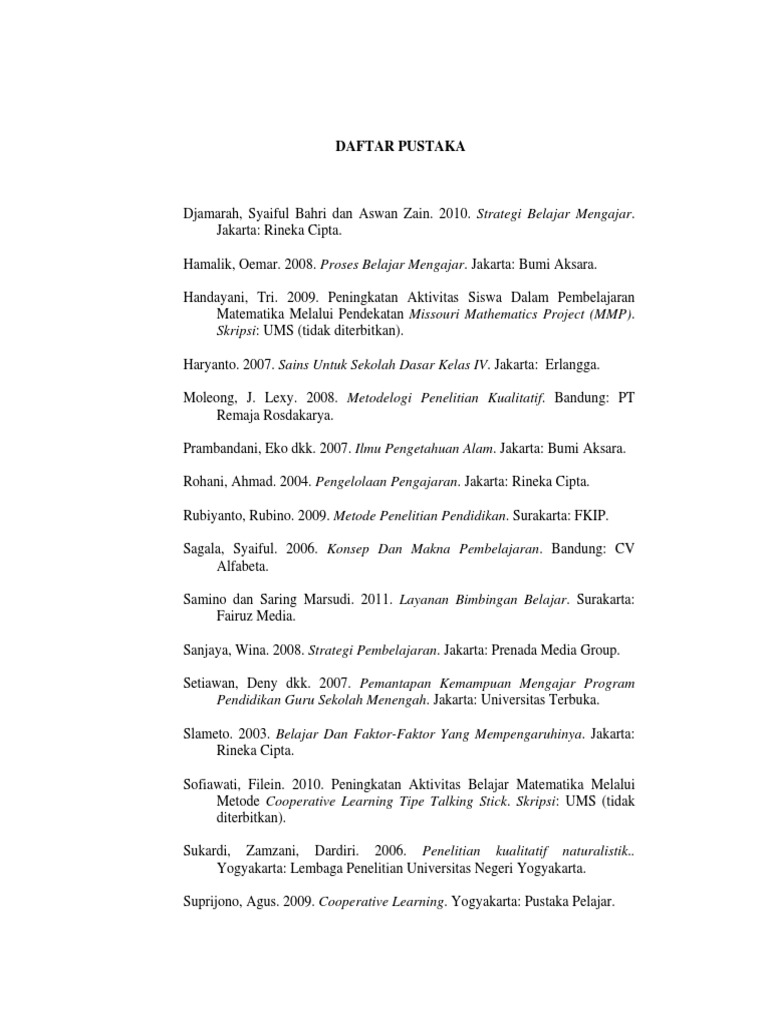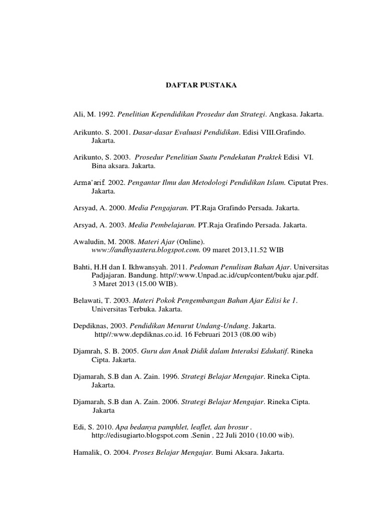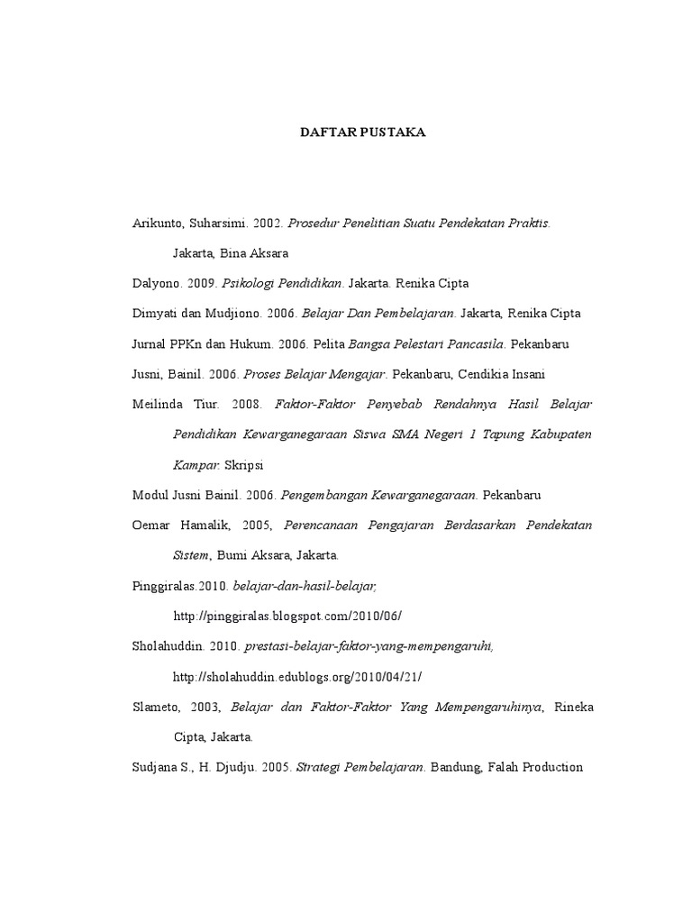 Daftar Pustaka Pustaka Sudjana Nana 2004 Dasar Dasar Proses Belajar Mengajar Thursan Hakim 2005 Belajar Secara Efektif Jakarta Puspa Swara Slameto 2003