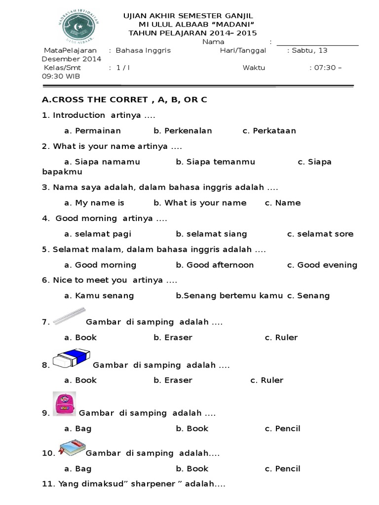 Contoh Soal Uts Semester Ganjil Bahasa Inggris Sd Kelas 1 Belajar Bahasa Inggris Online Gratis