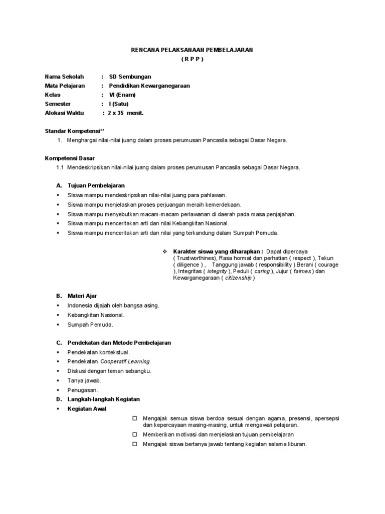 Rpp 1 Lembar Pendidikan Kewarganegaraan Kelas X Semester Gasal 2020 2021 Sinau Thewe Com