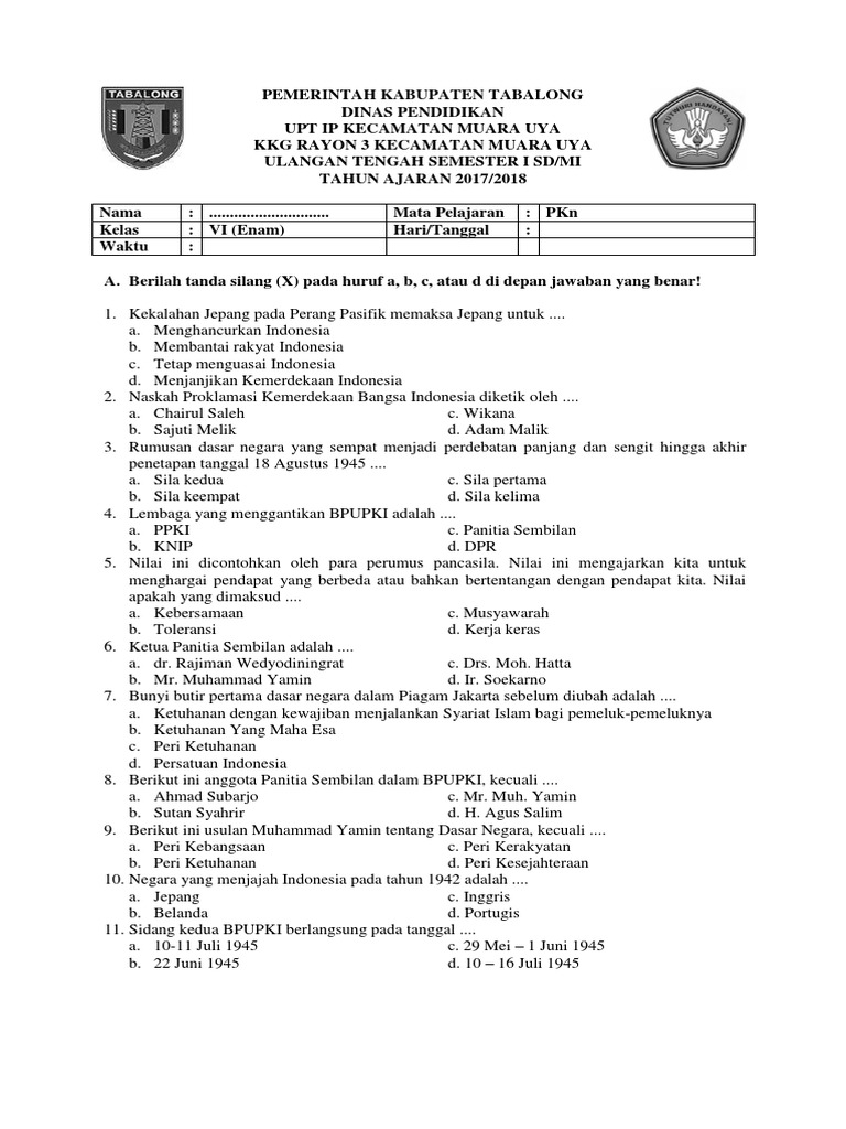 Contoh Soal Ulangan Tengah Semester Ii Mapel Pai Kelas 6 Mata Pelajaran Agama Nama Kelas Vi Enam Nilai Paraf Hari Islam Semester Education